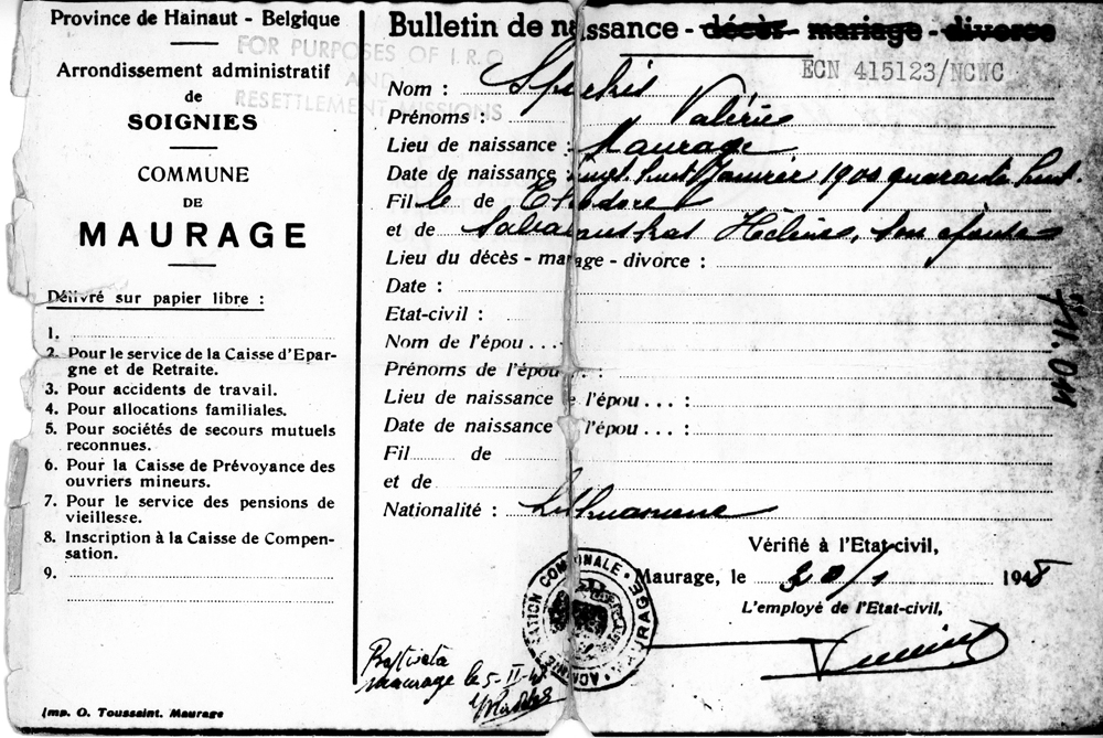 Birth certificate from Maurage, Belgium.