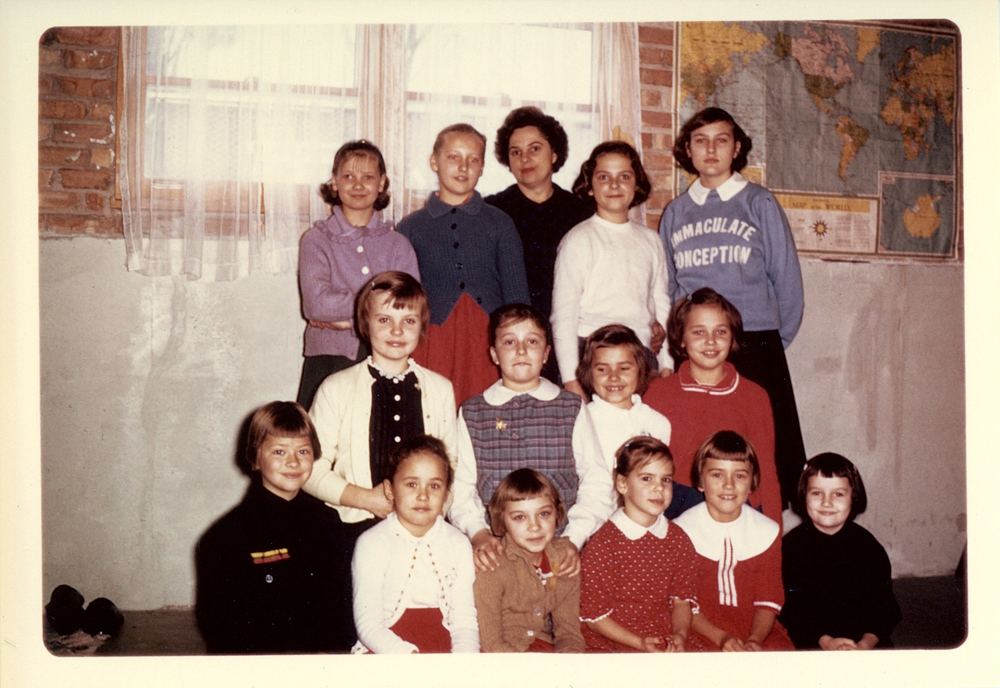 Valerie in the light blue sweatshirt in the back row, little sister Nijole on the bottom row end below her. Around 1960.